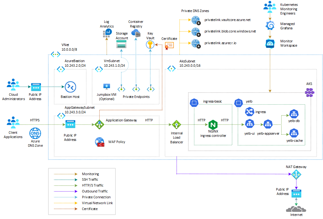 yelb-uiservice via HTTPS on port 443. - The Application Gateway Backend Pool and Health Probe call the NGINX ingress controller through the AKS internal load balancer using HTTPS.
