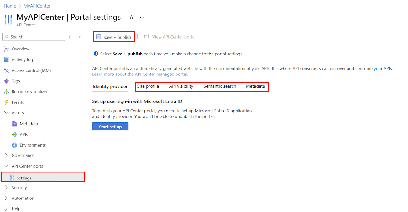 Azure portal で API センター ポータルの設定を構成します。 設定ページにアクセスするには: