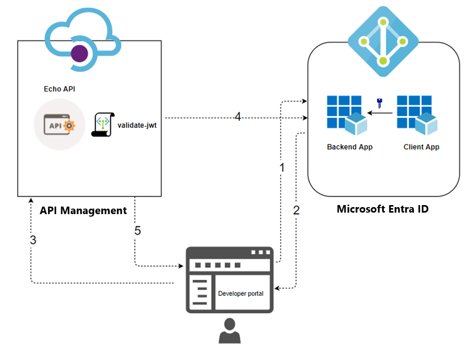 validate-jwtポリシーを使用して OAuth 2.0 プロバイダーで検証されます。 Microsoft Entra ID プロバイダーの場合、API Management によってvalidate-azure-ad-tokenポリシーも提供されます。検証結果に基づいて、開発者は開発者ポータルで応答を受け取ります。