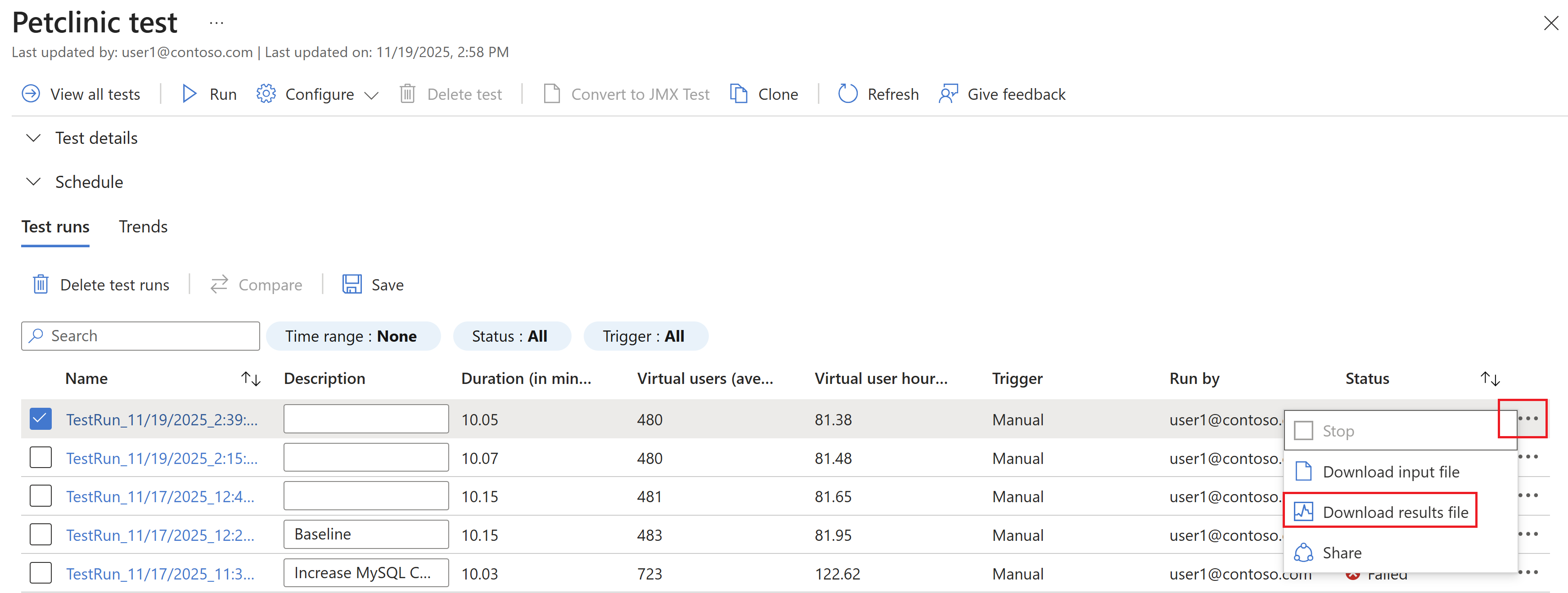 使用しているロード テストの実行の横にある省略記号 (...) を選択し、[ 結果ファイルのダウンロード] を選択します。