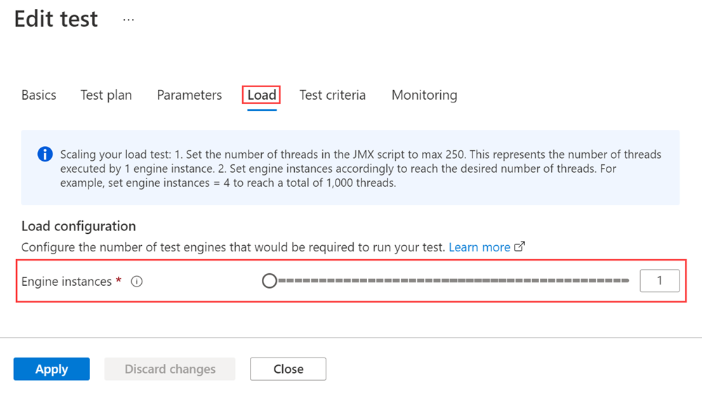 [テストの 編集] ページで、[読み込み] タブを選択します。[Engine instances] (エンジン インスタンス) スライダー コントロール を使用して、テスト エンジン インスタンスの数を更新するか、入力ボックスに値を直接入力します。
