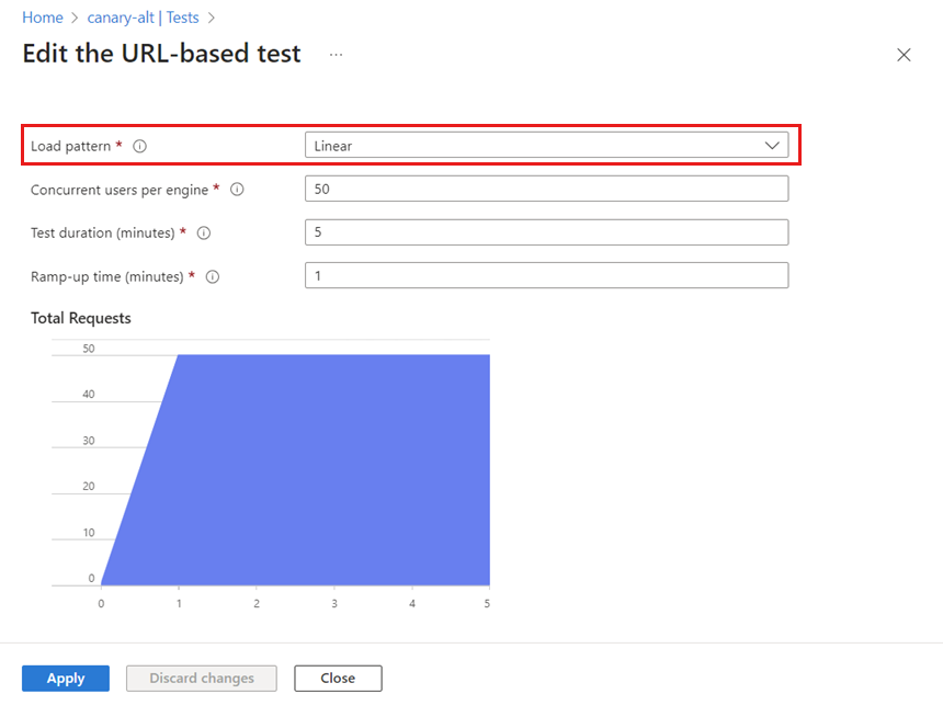 アプリケーションのユーザー トラフィックをシミュレートするには、読み込みパターンと、読み込みをシミュレートする仮想ユーザーの数を構成します。 Azure Load Testing では、多数の並列テスト エンジン インスタンスでロード テストを実行することで、アプリケーションへのトラフィックをシミュレートする仮想ユーザーの数をスケールアウトできます。 ロード パターンは、ロード テストの期間中に負荷がどのように分散されるかを決定します。 ロード パターンの例としては、線形、階段状、またはスパイク ロードがあります。