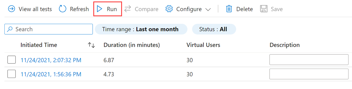 [ 実行 ] を選択して、新しい構成設定でロード テストを実行します。