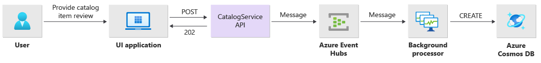 この記事では、要求の非同期処理やソリューション内で高スループットを実現する方法など、ミッション クリティカルなアプリケーションの信頼性と回復性の側面について説明します。 この記事シリーズでは、ユーザーがアイテムのカタログを参照し、アイテムの詳細を確認し、アイテムの評価とコメントを投稿できる、信頼性の高いワークロードの例として、単純なオンライン カタログ シナリオを使用します。