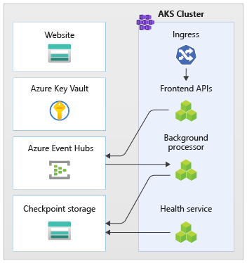 ワークロードは、API、ワーカー、正常性チェックアプリケーションで構成されています。 コンテナとしてワークロードをホストする workload という専用 AKS 名前空間。 ポッド間の直接通信は発生しません。 ポッドはステートレスで、独立して拡張できます。