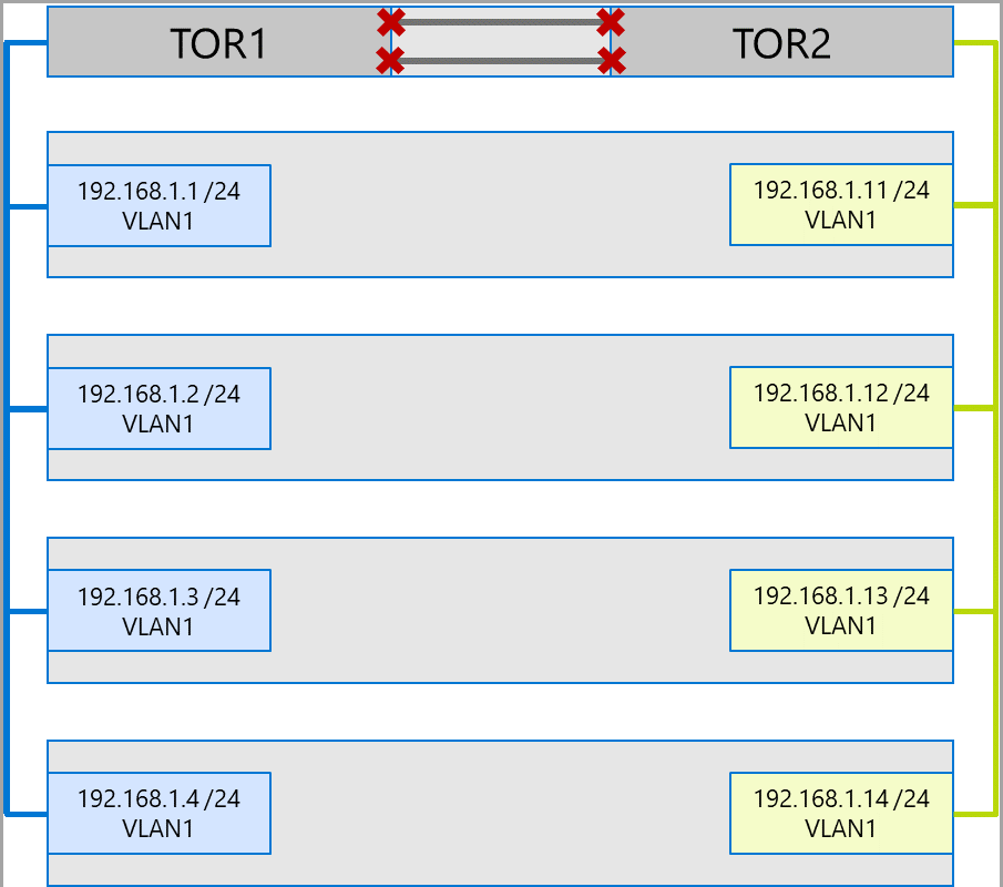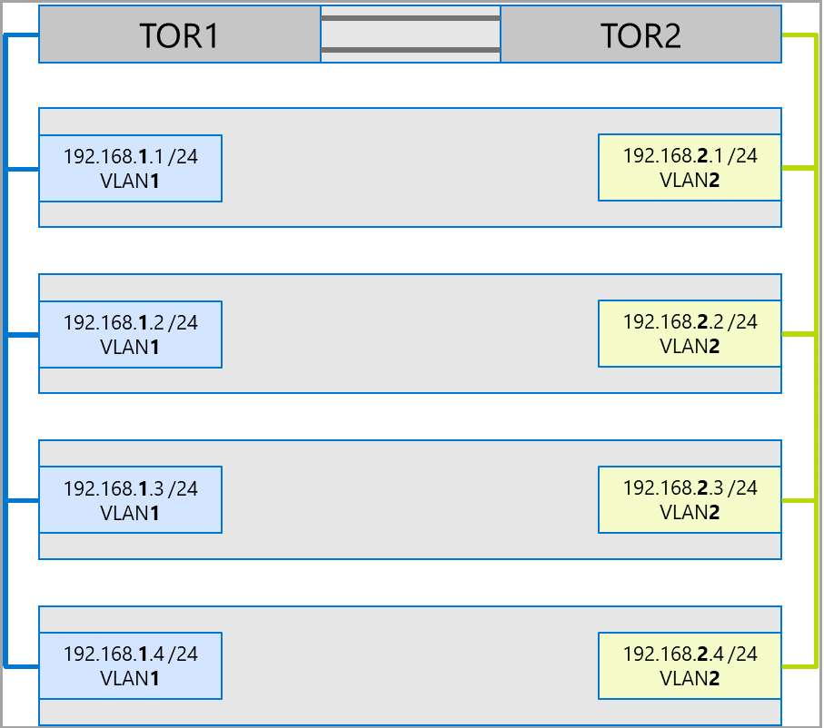 推奨されるアプローチは、アダプターのセットごとに個別のサブネットと VLAN を使用する方法です。 次の図では、右側のポートでサブネット 192.168.2.x /24 と VLAN2 が使用されています。 これにより、左側のポートのトラフィックは TOR1 に保持され、右側のポートのトラフィックは TOR2 に保持されます。