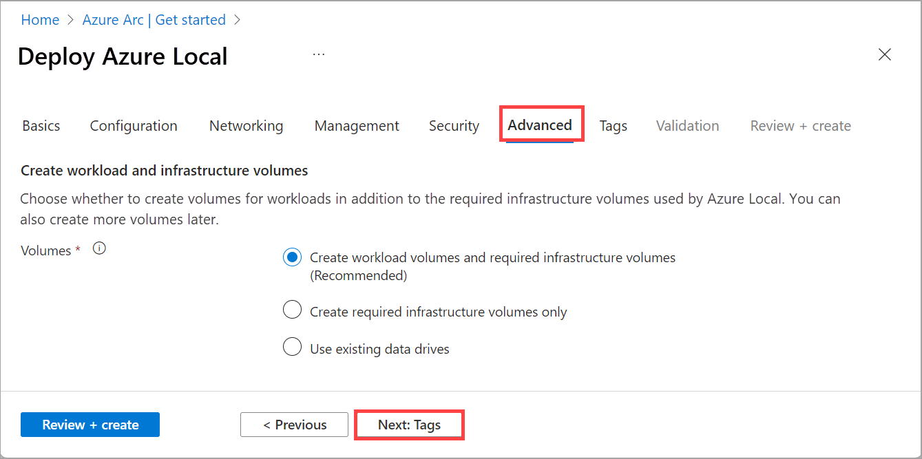 - デプロイ中にワークロード ボリュームを作成しなかった場合は、各ボリュームのワークロード ボリュームとストレージ パスを作成します。 詳細については、「 Azure Local および Windows Server クラスターでのボリュームの作成および Azure Local のストレージ パスの作成を参照してください。