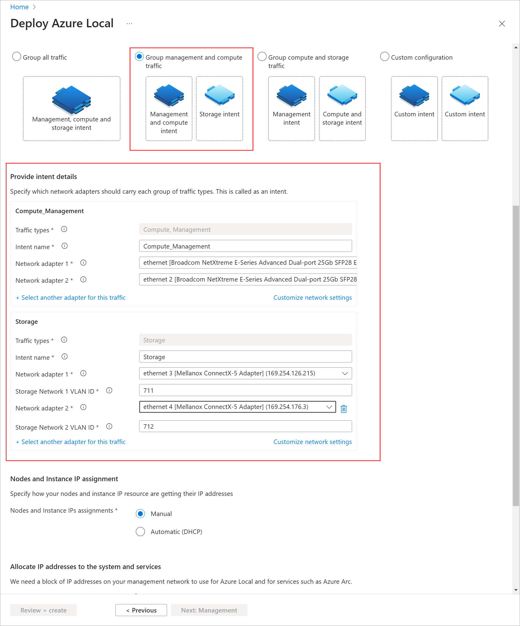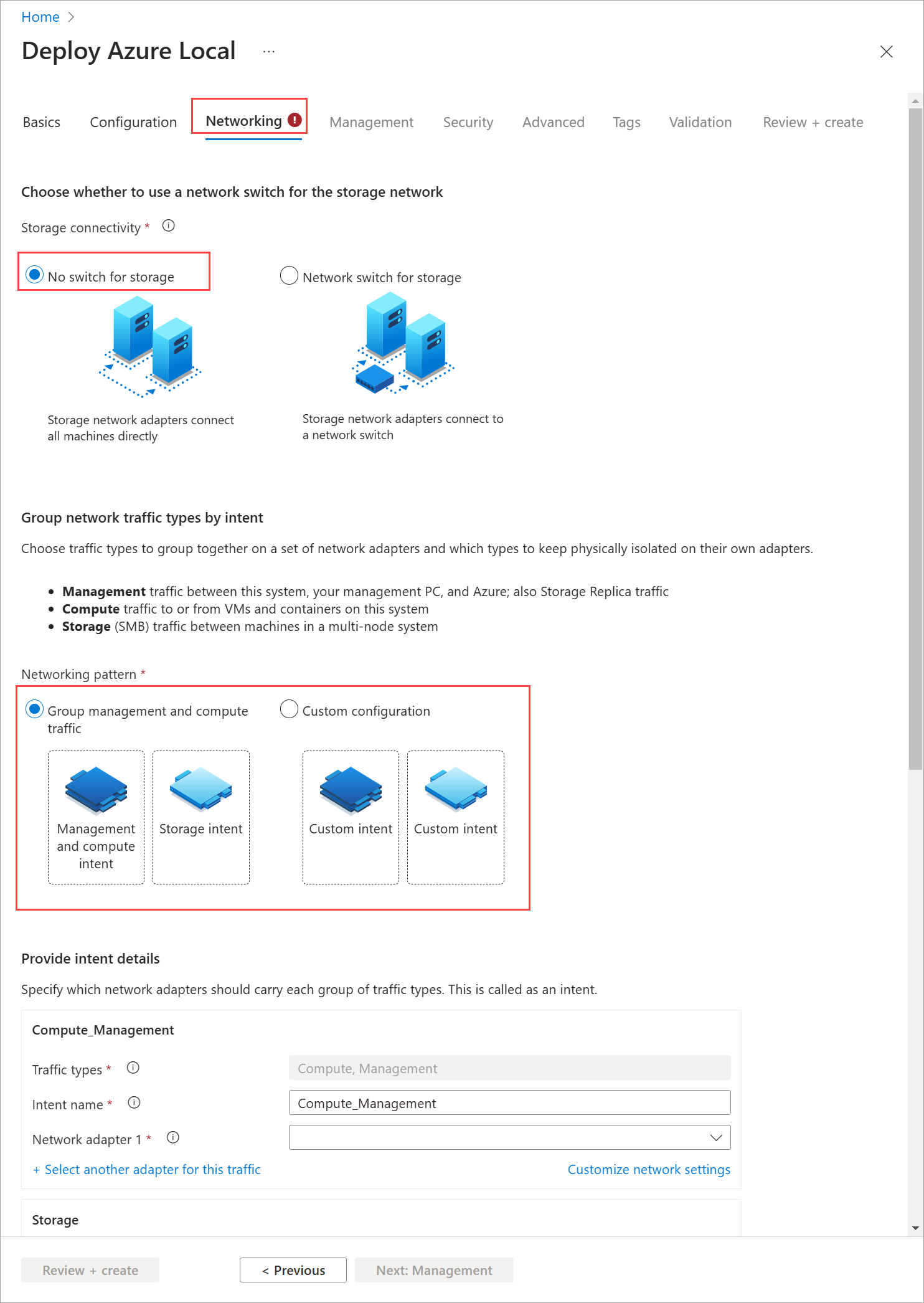 コンピューティング トラフィックとストレージ トラフィックのグループ化 - ストレージ トラフィックにネットワーク スイッチを使用している場合は、管理トラフィックを別のアダプター セットで分離したまま、高速アダプターでコンピューティング トラフィックとストレージ トラフィックをグループ化できます。 次の 2 つのネットワーク意図を作成します。