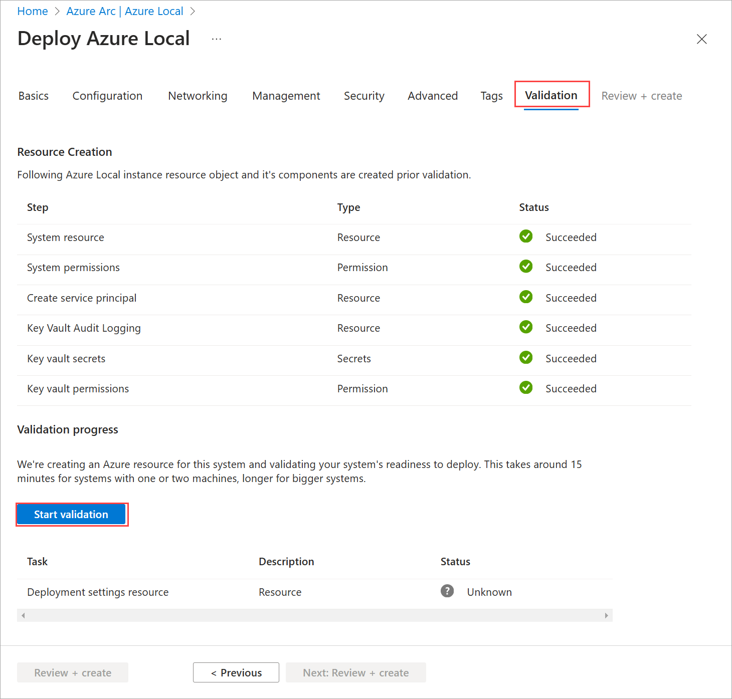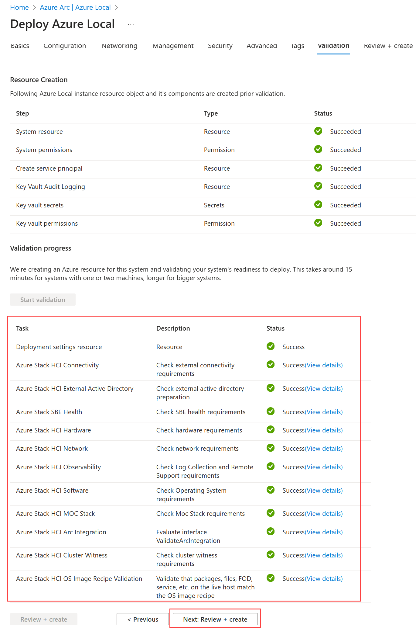 検証にエラーがある場合は、実行可能な問題を解決し、 次へ: 確認と作成を選択。