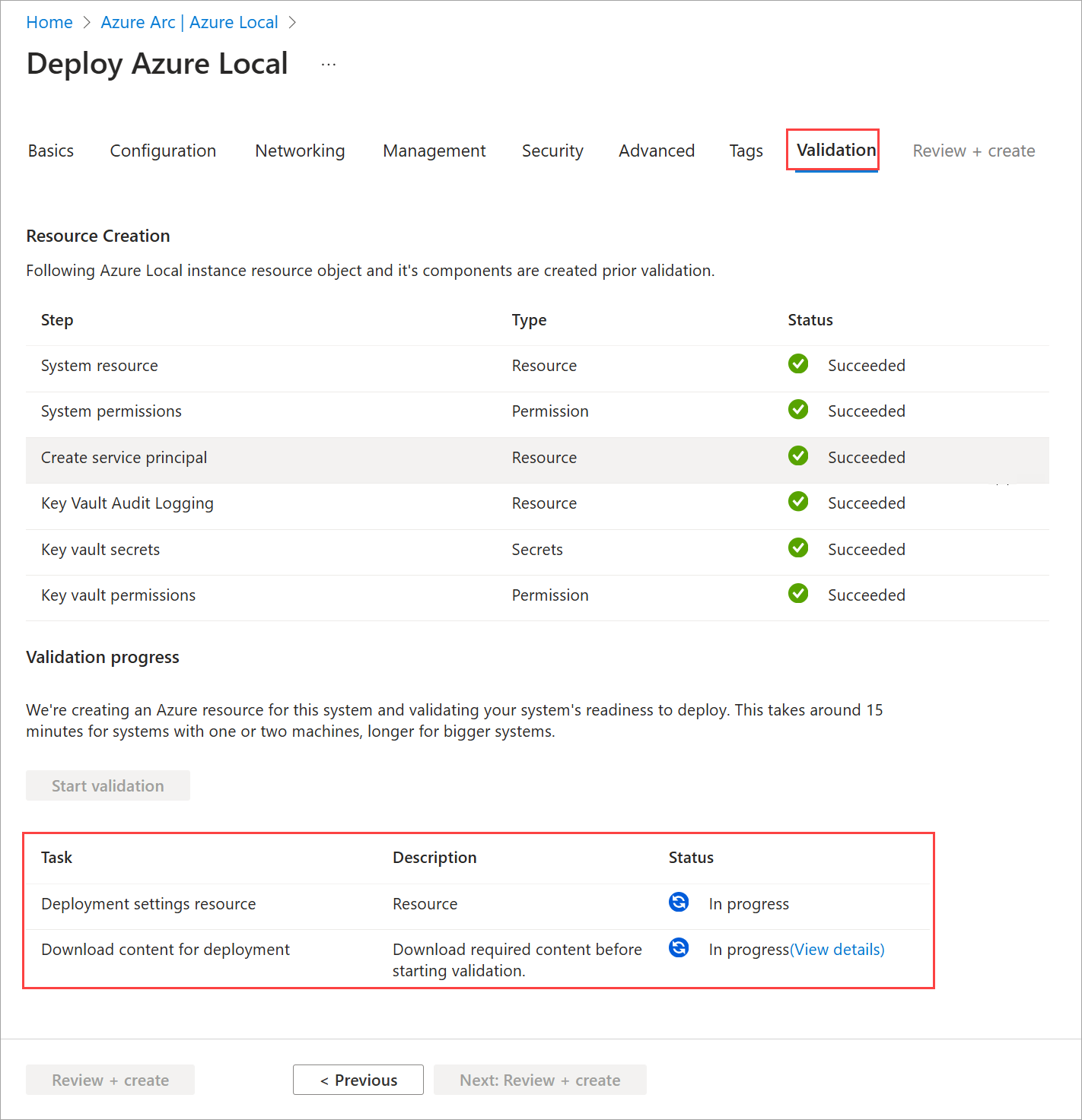 Get-ClusterNode | % { Get-WinEvent -ComputerName $_ -LogName Microsoft-AzureStack-HCI/Admin | ? Id -eq 609 }デプロイのタイミング。 デプロイが開始されると、デプロイの最初の手順である [クラウドデプロイの開始] が完了するまでに 45 ~ 60 分かかる場合があります。 1 台のマシンのデプロイ時間の合計は約 1.5 ~ 2 時間ですが、2 ノード システムのデプロイには約 2.5 時間かかります。