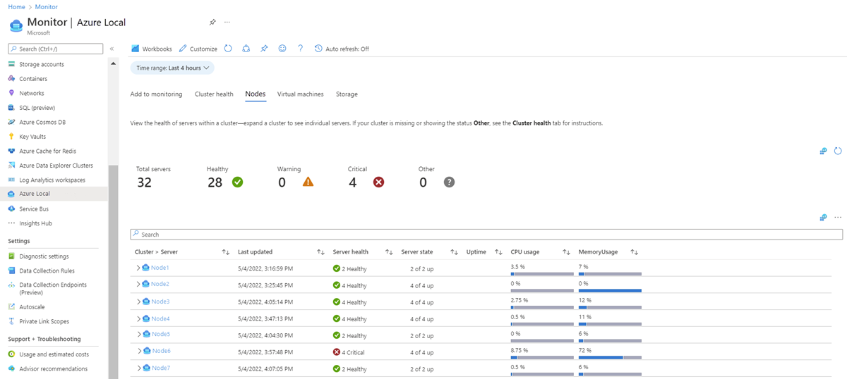 このビューでは、ノードの正常性とパフォーマンス、および選択したクラスターの使用状況の概要を示します。 このビューは、Microsoft-Windows-SDDC-Management/Operational Windows イベント ログ チャネルのサーバー イベント ID 3000 を使用して作成されます。 各行をさらに展開して、ノードの正常性状態を確認できます。 クラスターとノード リソースを操作して、それぞれのリソース ページに移動できます。