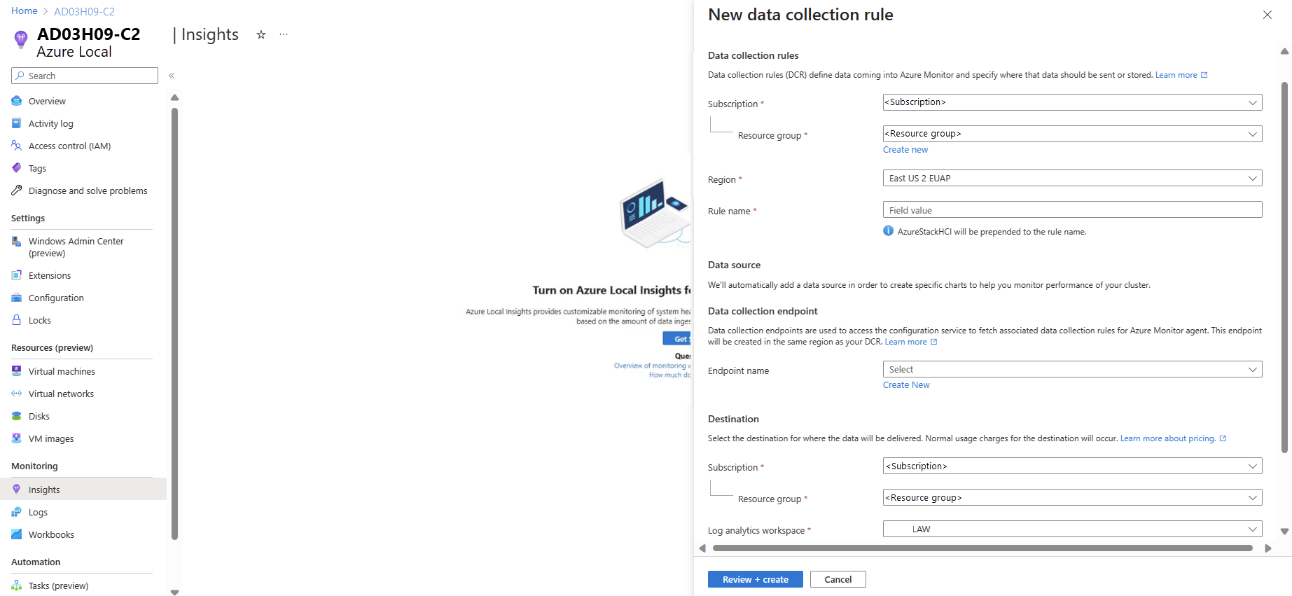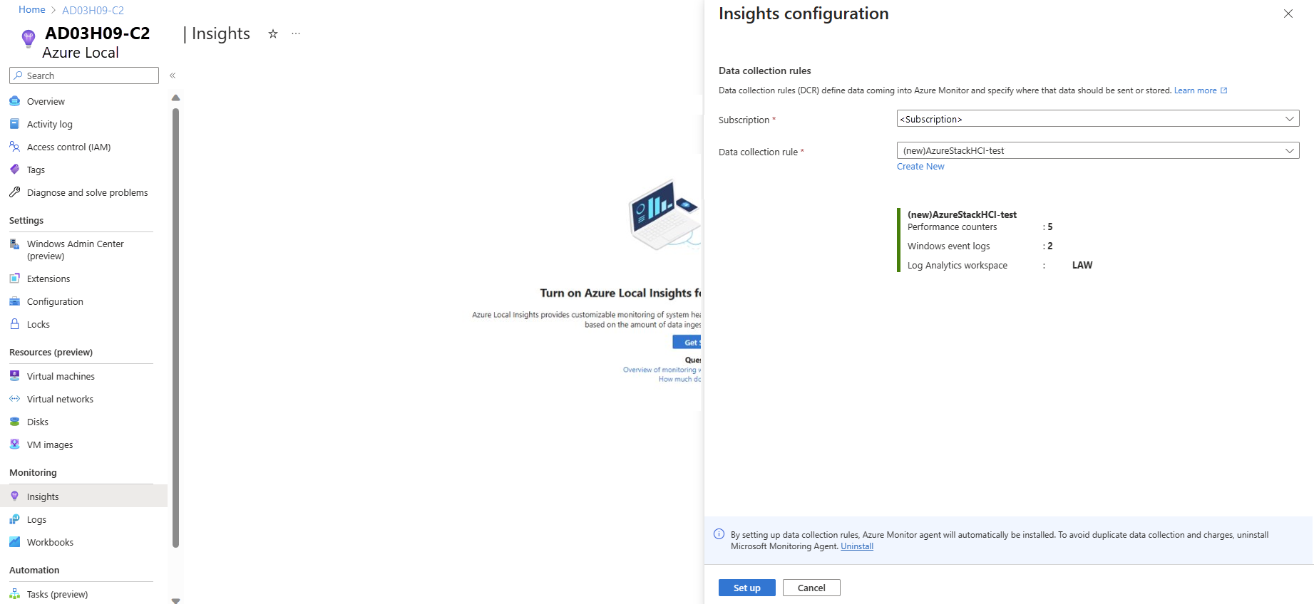 Insights を有効にすると、便利な正常性メトリックを提供することで、Log Analytics ワークスペースに現在関連付けられているすべての Azure ローカル システムを監視できます。 Insights は Azure Monitor エージェントをインストールし、Azure ローカル システムを監視するための データ収集規則 (DCR) を構成するのに役立ちます。
