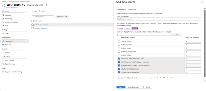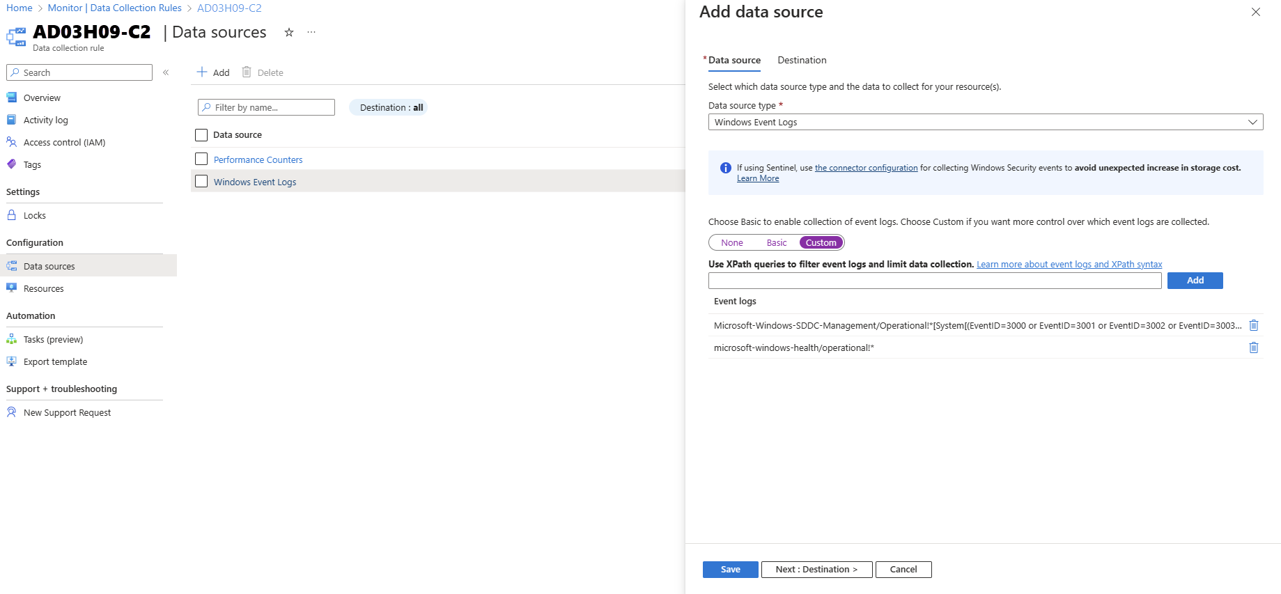 - 関連付けられている DCR の構成を確認します。 「 Data コレクション ルール 」セクションで説明されているように、イベント チャネルとパフォーマンス カウンターが、関連付けられている DCR にデータ ソースとして追加されていることを確認します。