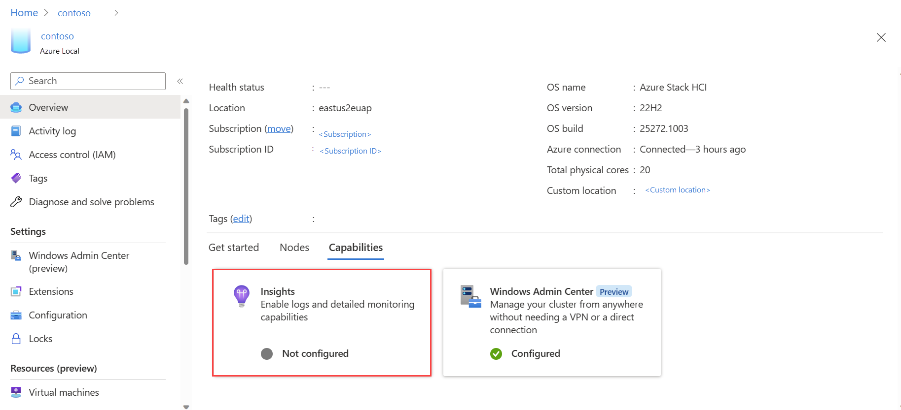 Azure ローカル リソース ページに移動し、システムを選択します。 Insights が Capabilities タブに Configured と表示されるようになりました。