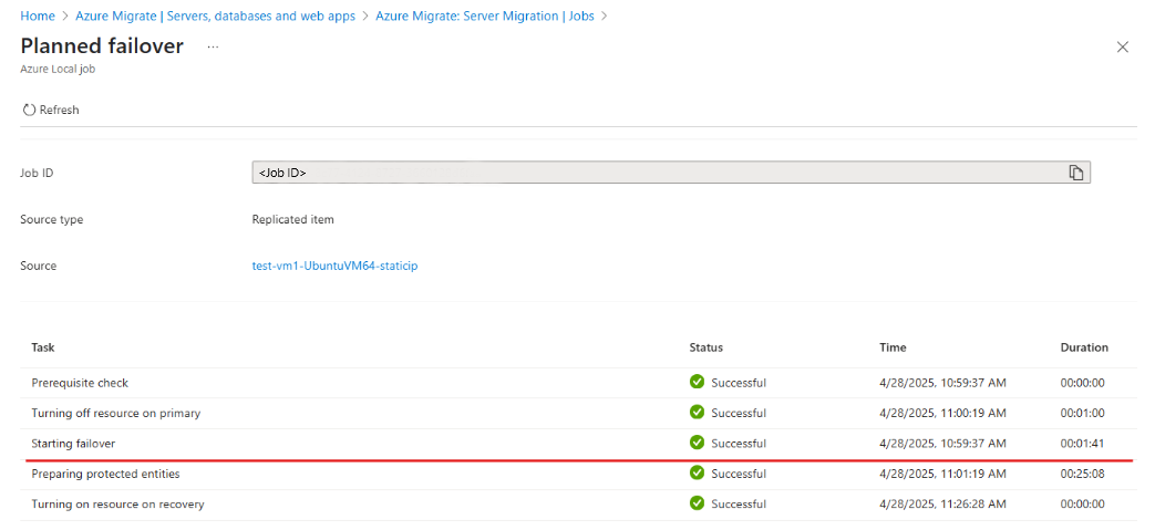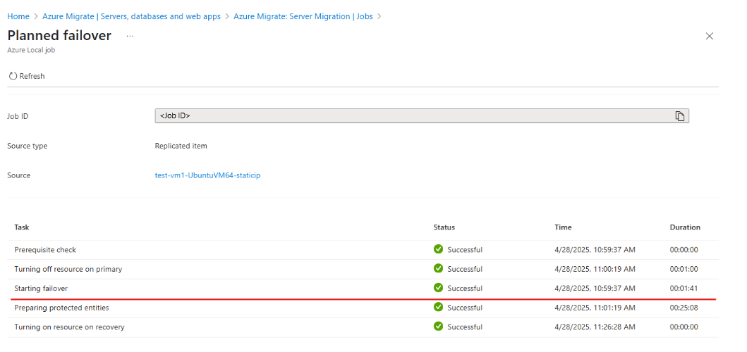 エラーが発生した場所を確認するには、Azure Migrate ポータルで計画フェールオーバー ジョブを開きます。 ジョブの詳細を使用して、Azure ローカル インスタンスで VM の作成前または作成後にエラーが発生したかどうかを特定します。