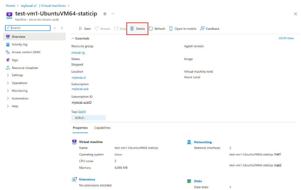 Azure portal で、ターゲットの Azure ローカル インスタンスに移動します。