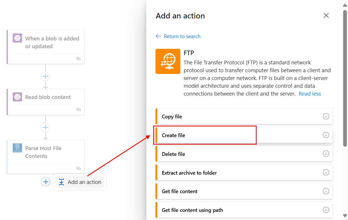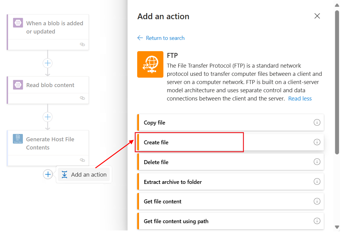 この例では、 次の一般的な手順に従って、ファイル転送プロトコル (FTP) サーバーにファイルを作成するアクションを追加します。