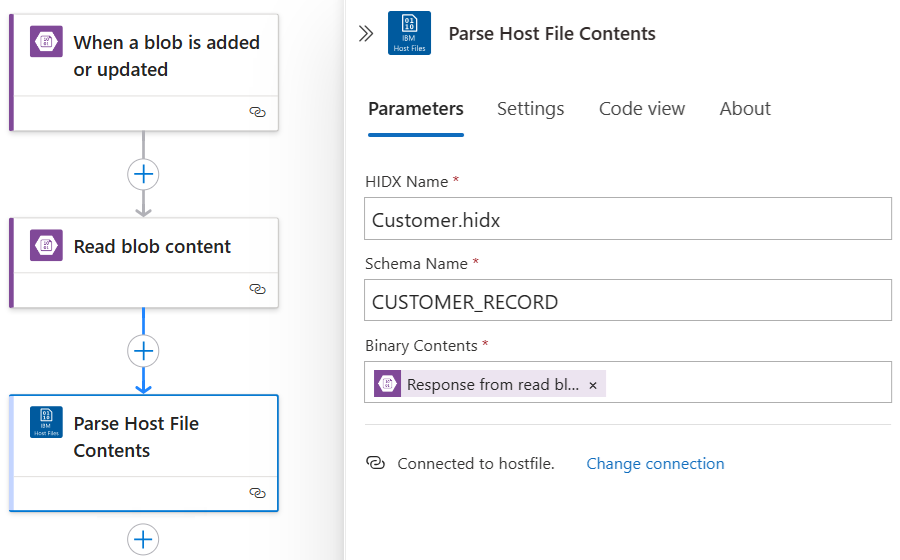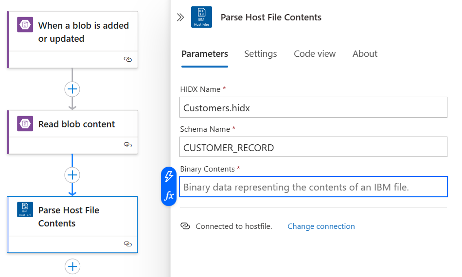 このガイドの後半で、[ ホスト ファイル コンテンツの解析 ] アクションを初めてワークフローに追加すると、接続の作成を求めるメッセージが表示されます。 接続を作成したら、以前に追加した HIDX ファイル、スキーマ、および使用するパラメーターを選択できます。