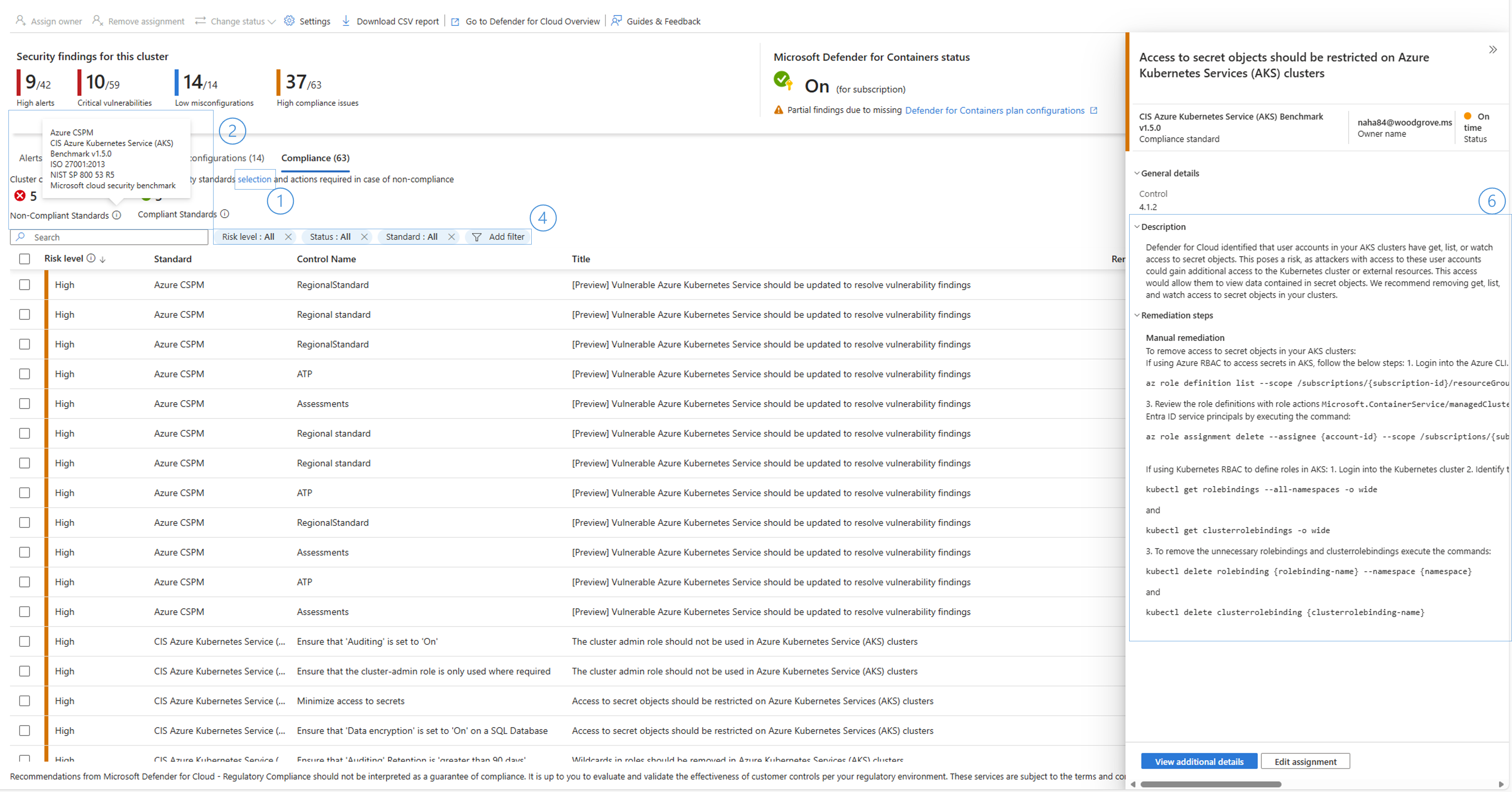 コンプライアンス セクションには、規制基準とベンチマークに対するクラスターの状態が表示されます。