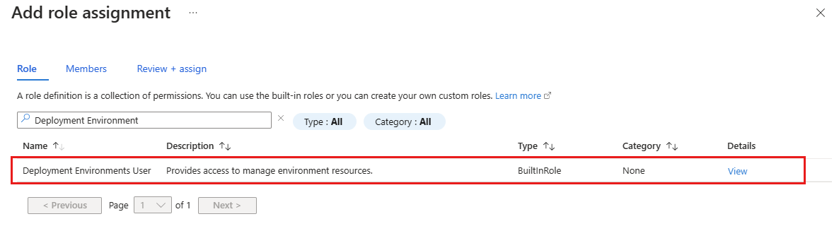 特定の環境の種類の環境を表示する必要がある開発者に、DevCenter Deployment Environments 閲覧者ロールを割り当てます。