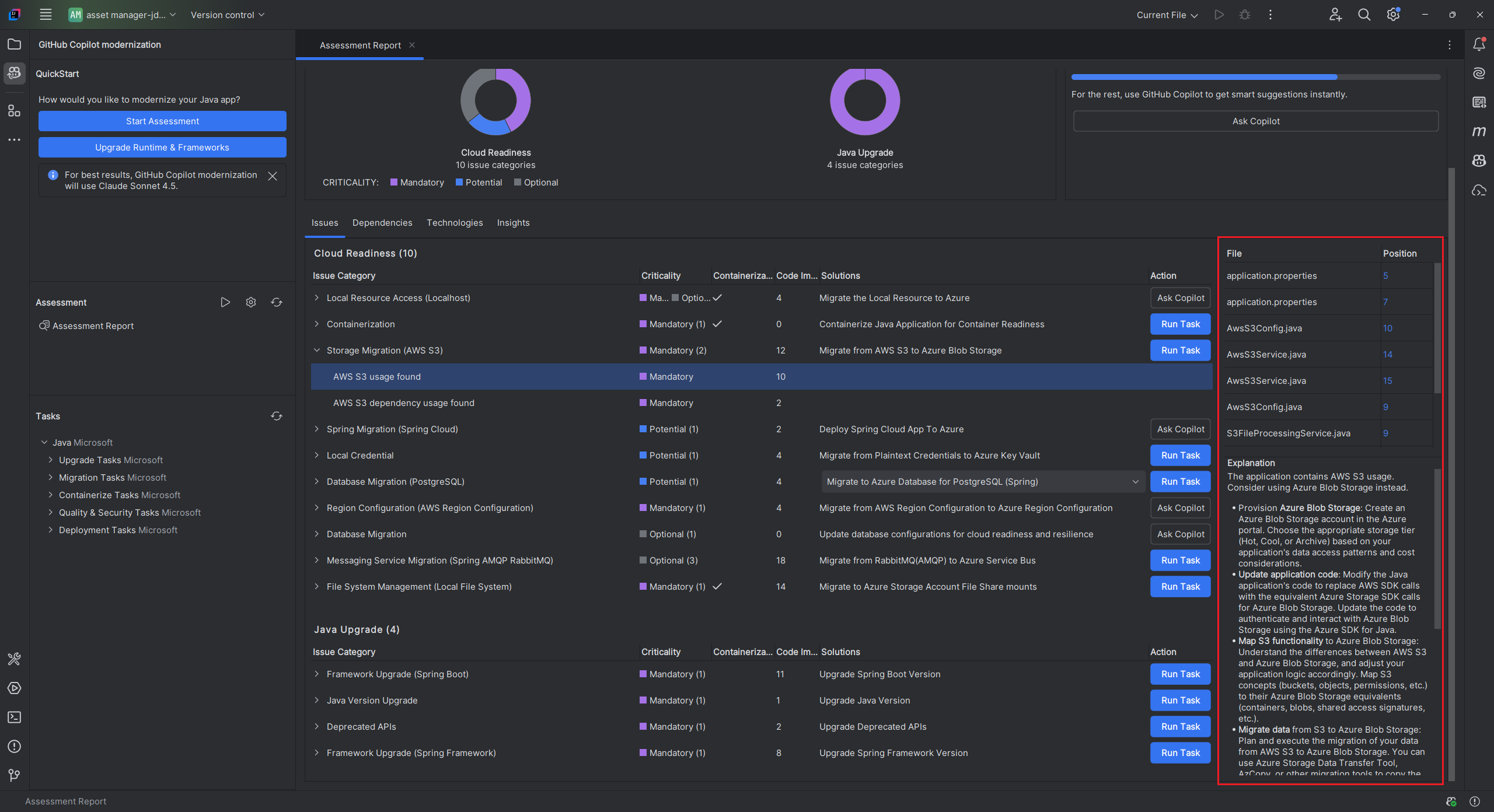 ツールが評価を完了すると、新しいレポートが生成され、レポート一覧に追加されます。 対話型ダッシュボードが自動的に開き、包括的な分析結果が提供されます。 複数の Azure サービス ターゲットを構成したら、それらを簡単に切り替えて移行方法を比較し、サービス固有の推奨事項を表示できます。
