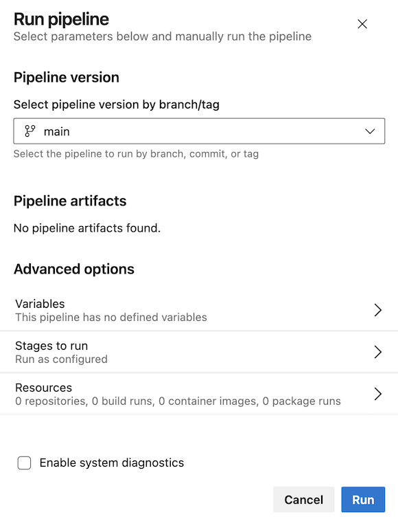 - パイプラインでパラメーターが定義されていない場合、[パイプラインの 実行 ] パネルは、現在と同様の 1 つのステップです。