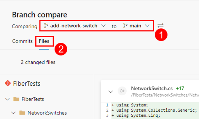[分岐比較] ビューで、比較する 2 つの分岐を選択します。 [ ファイル ] タブを選択すると、変更された各ファイルの新しい行、削除された行、または変更された行の差分ビューが表示されます。