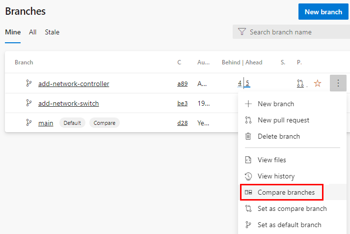 Web ブラウザーから、Azure DevOps 組織のチーム プロジェクトを開きます。 [ Repos > Branchs]\(リポジトリブランチ \) ビューで、任意のブランチの省略記号を選択し、[ ブランチの比較 ] を選択して ブランチ比較 ビューを開きます。