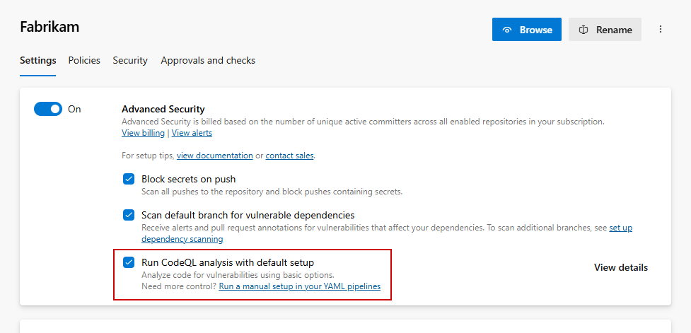 既定のセットアップから開始することをお勧めします。 異なるエージェント プール、コンパイル済み言語のカスタム ビルド 手順、複数のブランチ間でのスキャンなど、スキャン構成をより詳細に制御する必要がある場合は、同じ組織内で既定のセットアップと高度なセットアップの両方を実行できます。 詳細については、「 コード スキャンの設定」を参照してください。