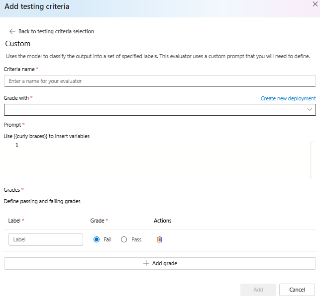 モデルを使用して、出力を指定されたラベルのセットに分類します。 このエバリュエータは、定義する必要があるカスタム プロンプトを使用します。