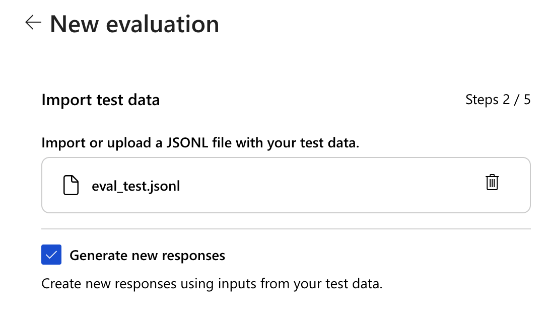 評価用のテスト データを提供する方法を選択します。 保存されているチャット入力候補をインポートしたり、指定された既定のテンプレートを使用してデータを作成したり、独自のデータをアップロードしたりすることができます。 独自のデータをアップロードする手順を見てみましょう。
