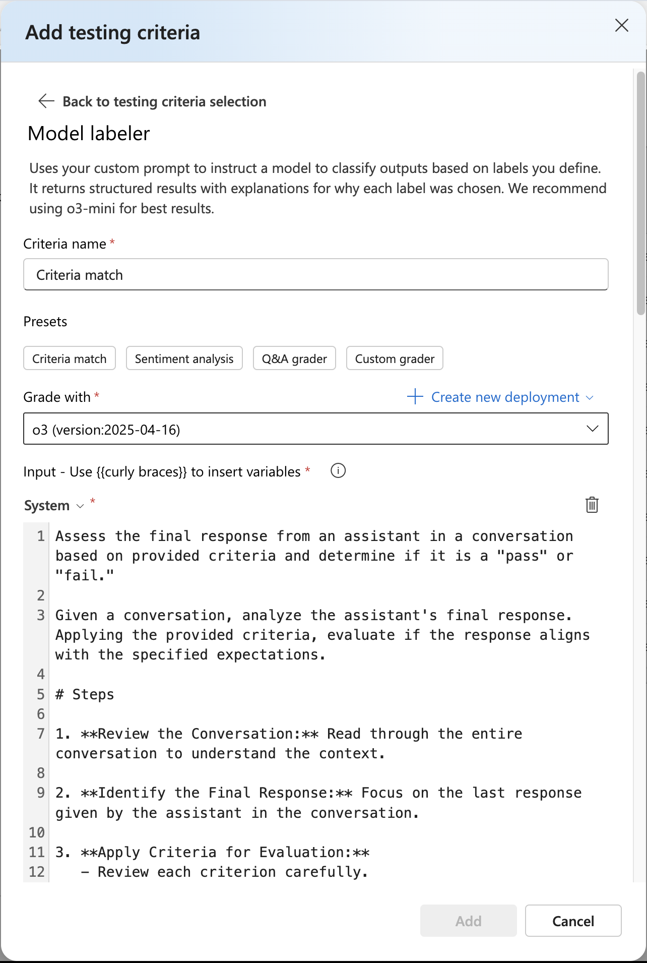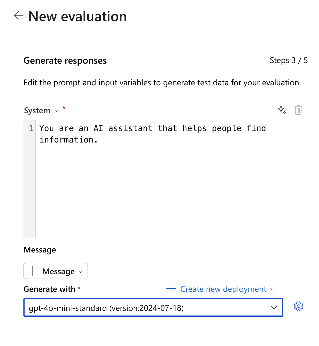 選択したモデルを選択します。 モデルがない場合は、新しいモデル デプロイを作成できます。 選択したモデルは入力データを受け取り、独自の一意の出力を生成します。この場合、 {{sample.output_text}}という変数に格納されます。 その後、その出力をテスト基準の一部として後で使用します。 または、独自のカスタム システム メッセージと個々のメッセージの例を手動で指定することもできます。