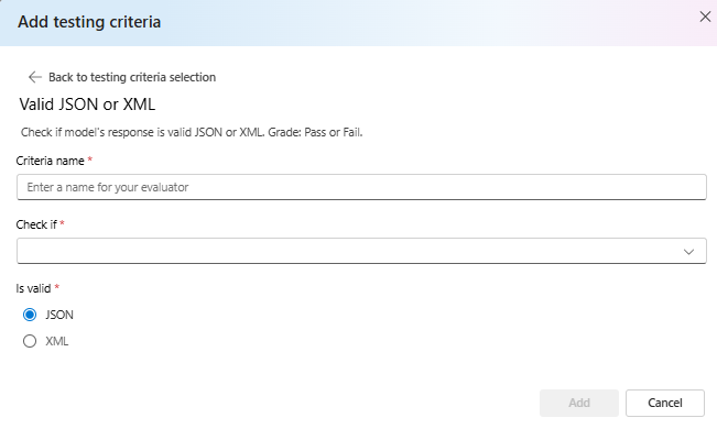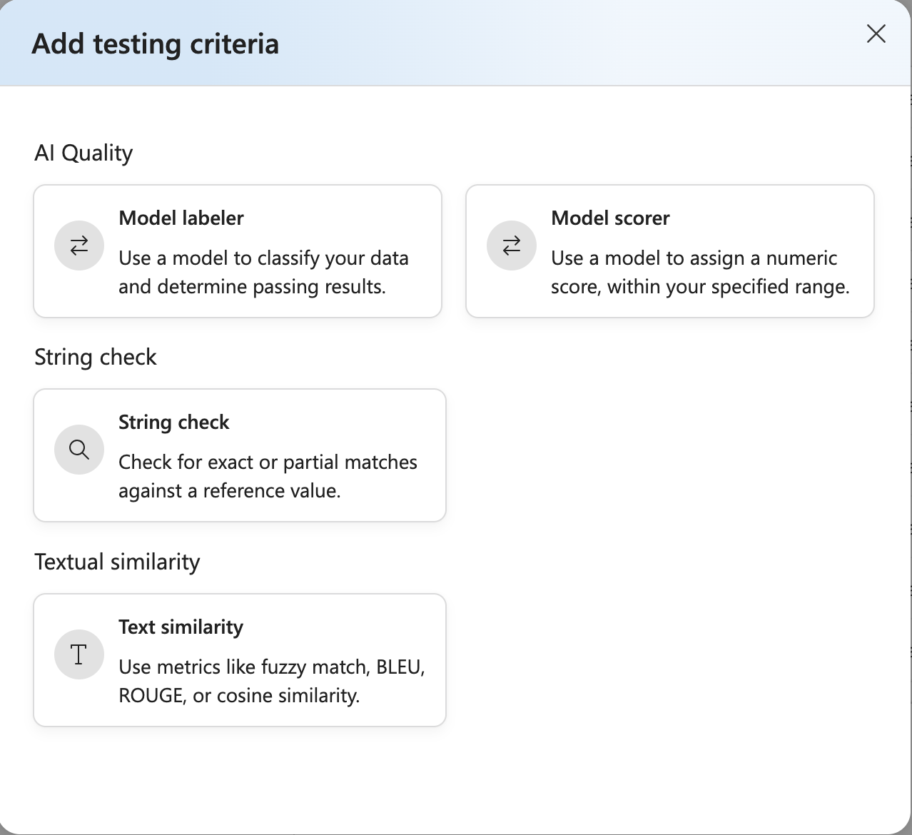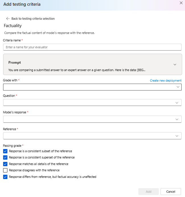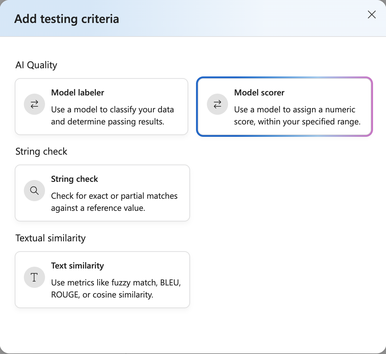テスト条件を作成するには、[追加] を選択 します。 提供したサンプル ファイルでは、セマンティックの類似性を評価します。 セマンティック類似性のテスト基準プリセットを含む モデル スコアラーを選択します。