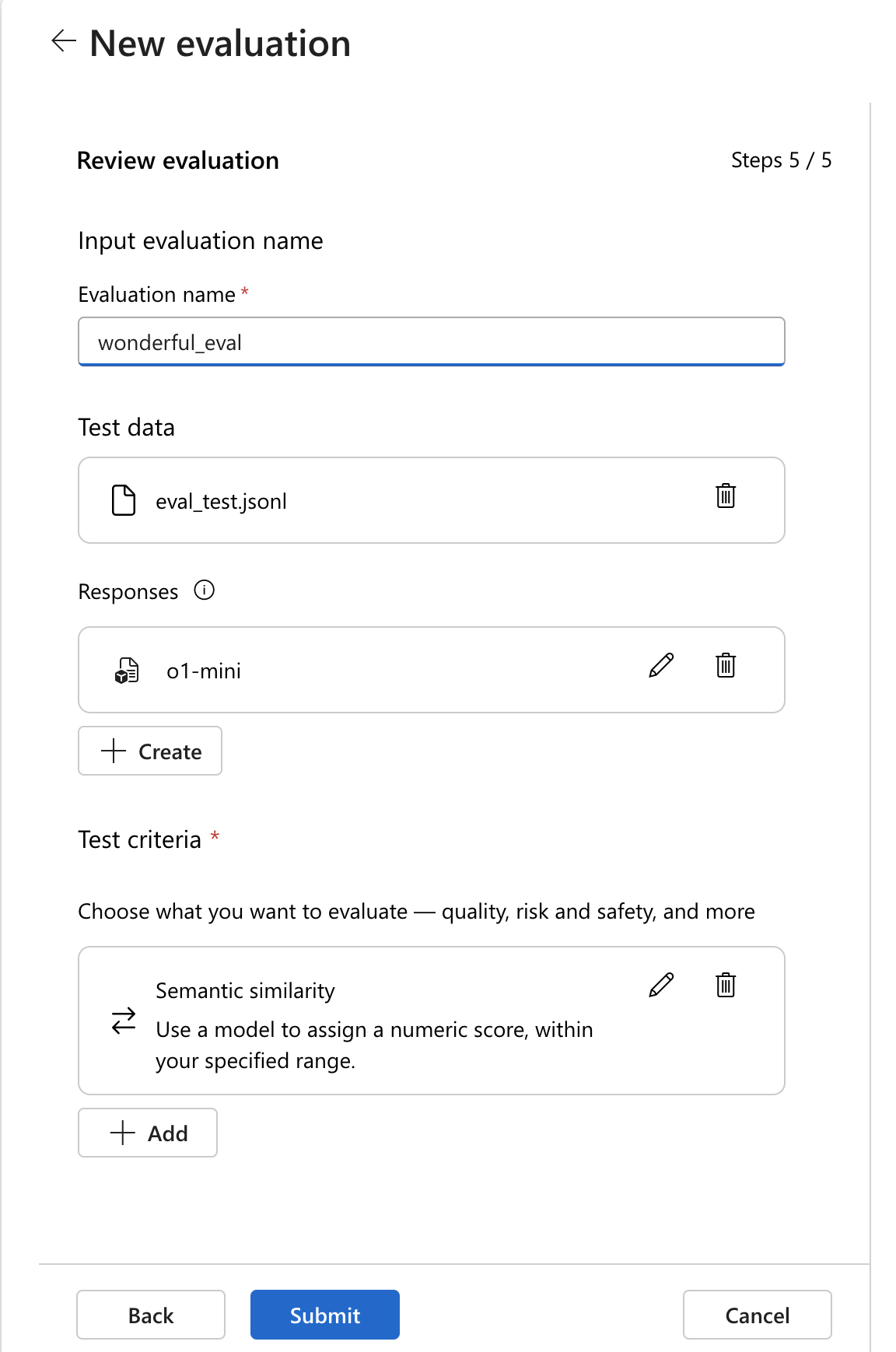 データ ソース構成と評価テスト条件を指定して評価を作成できます。 データ ソース構成を定義するさまざまな方法の 1 つを次に示します。1 つ以上のテスト条件を指定することもできます。