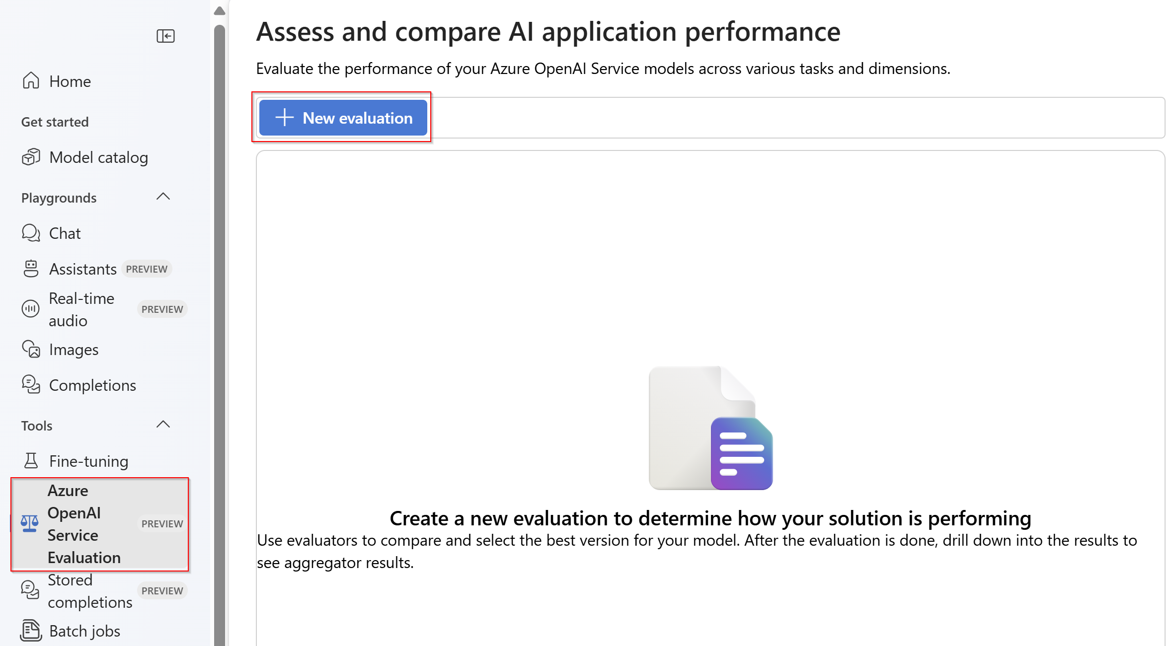 Microsoft Foundry ポータル 内の Azure OpenAI Evaluation (PREVIEW) を選択。 このビューをオプションとして表示するには、まず、サポートされているリージョンの既存の Azure OpenAI リソースを選択します。