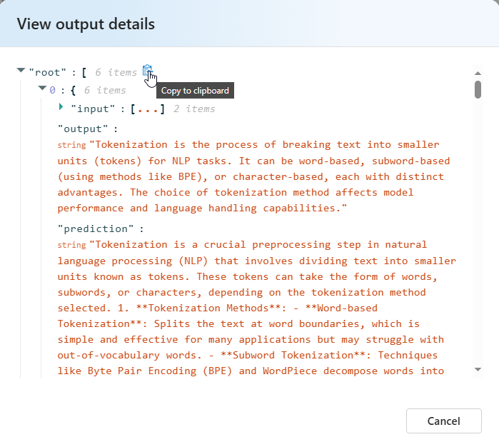 - セマンティック類似性の [View output details]\(出力詳細の表示\) に、合格したテストをコピーして貼り付けられる JSON 表現が含まれます。
