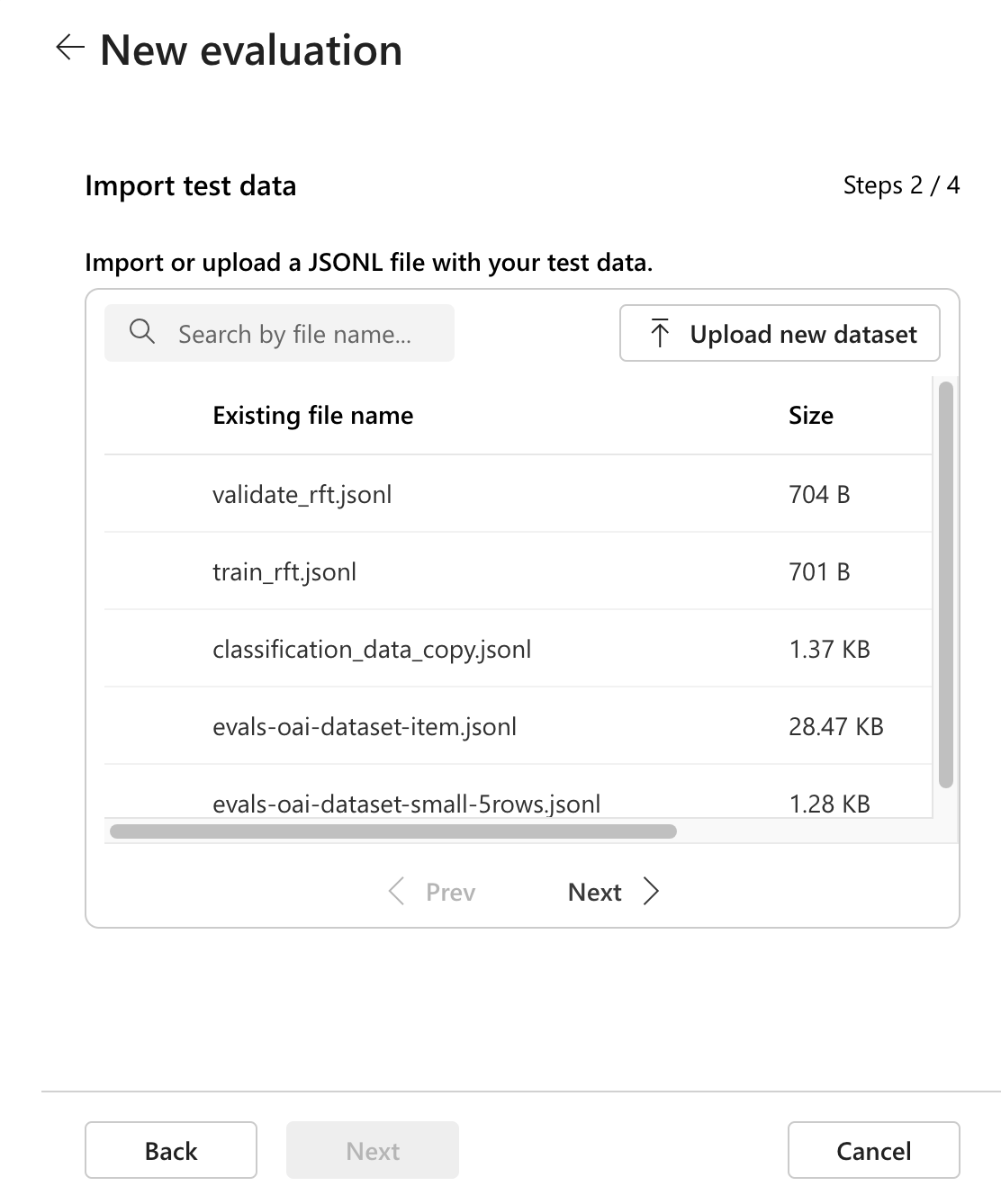 .jsonl形式の評価データを選択します。 既存のデータが既にある場合は、データを選択するか、新しいデータをアップロードできます。新しいデータをアップロードすると、右側にプレビューとしてファイルの最初の 3 行が表示されます。