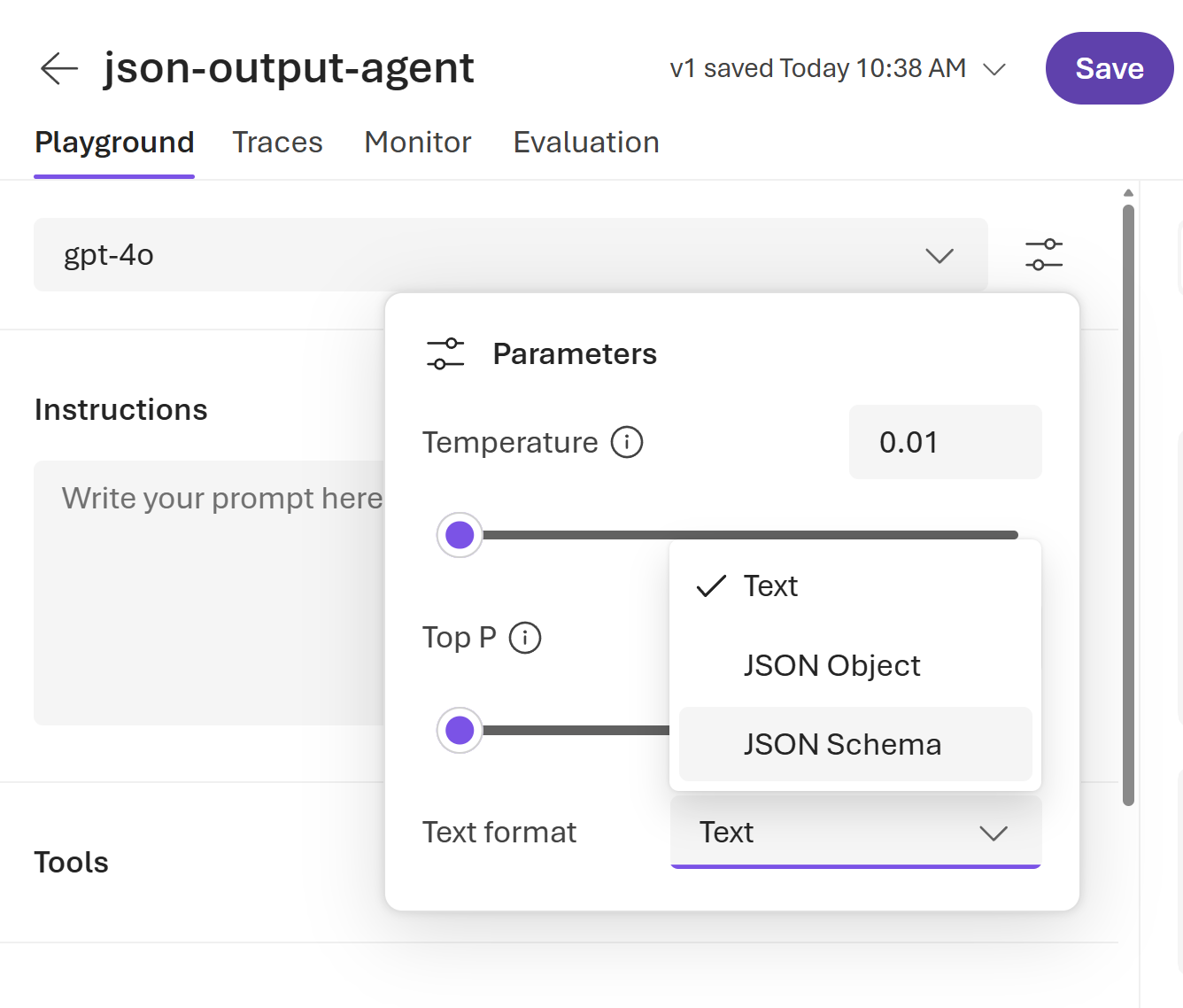 JSON スキーマとして出力を送信するようにエージェントを構成します。