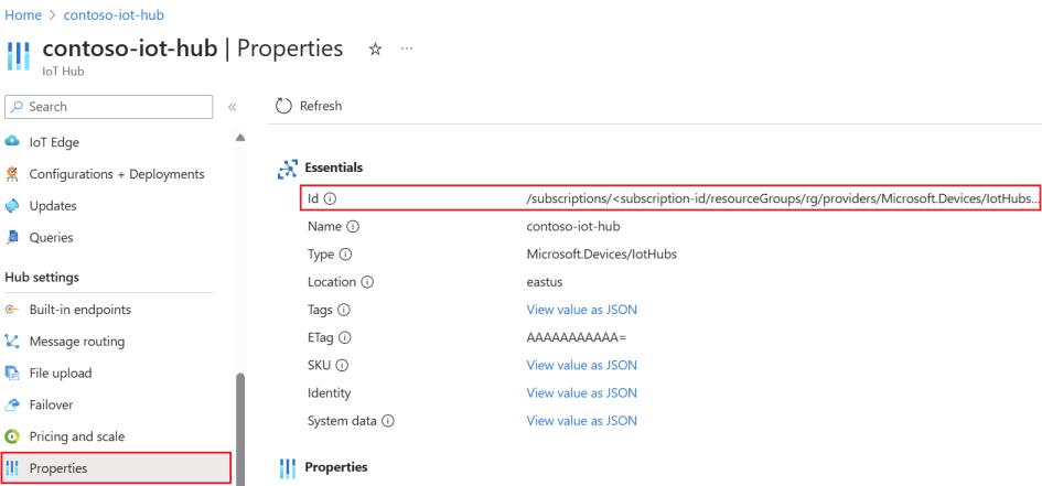 リソース ID は、Azure Portal 内の IoT Hub の [プロパティ] ページにあります。