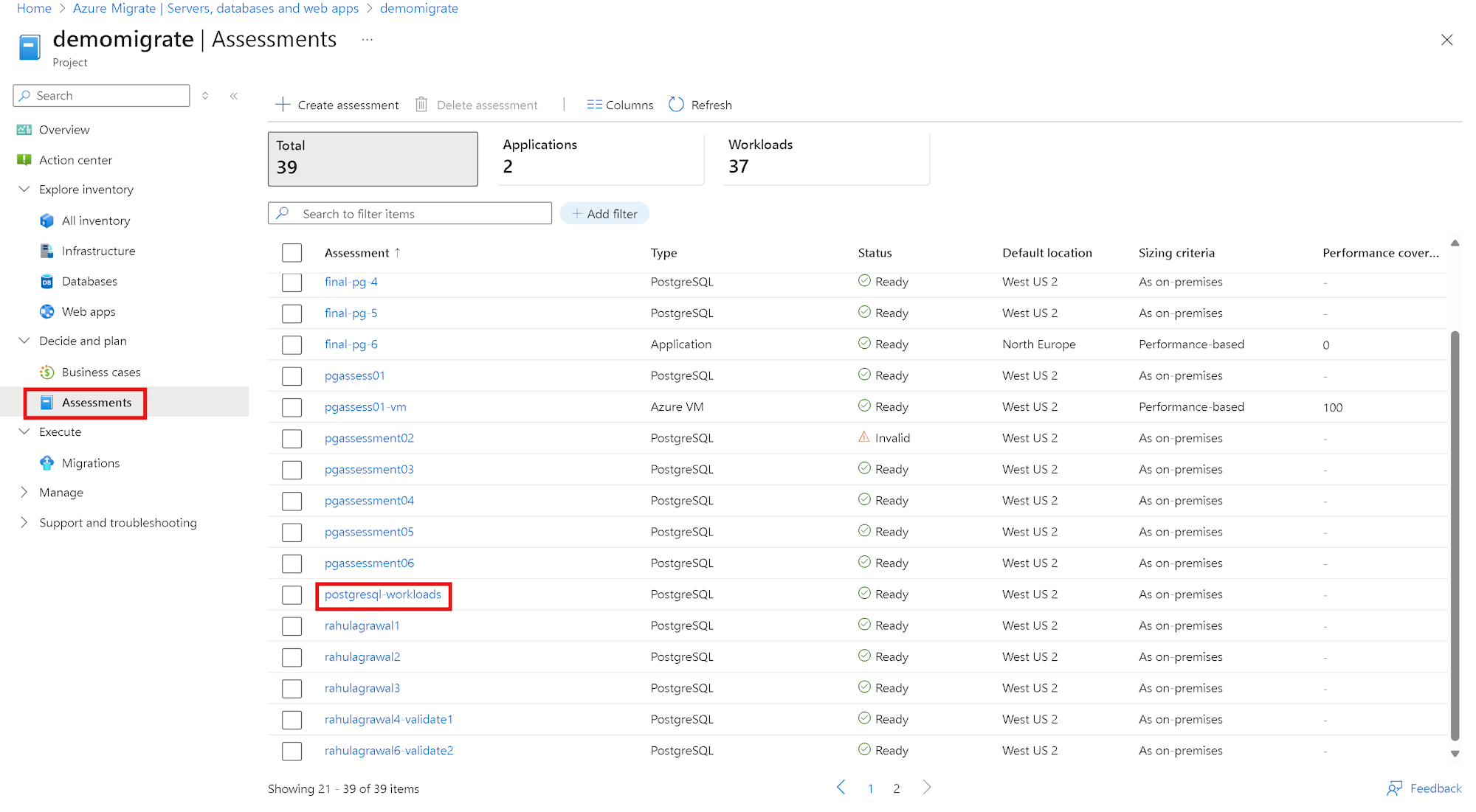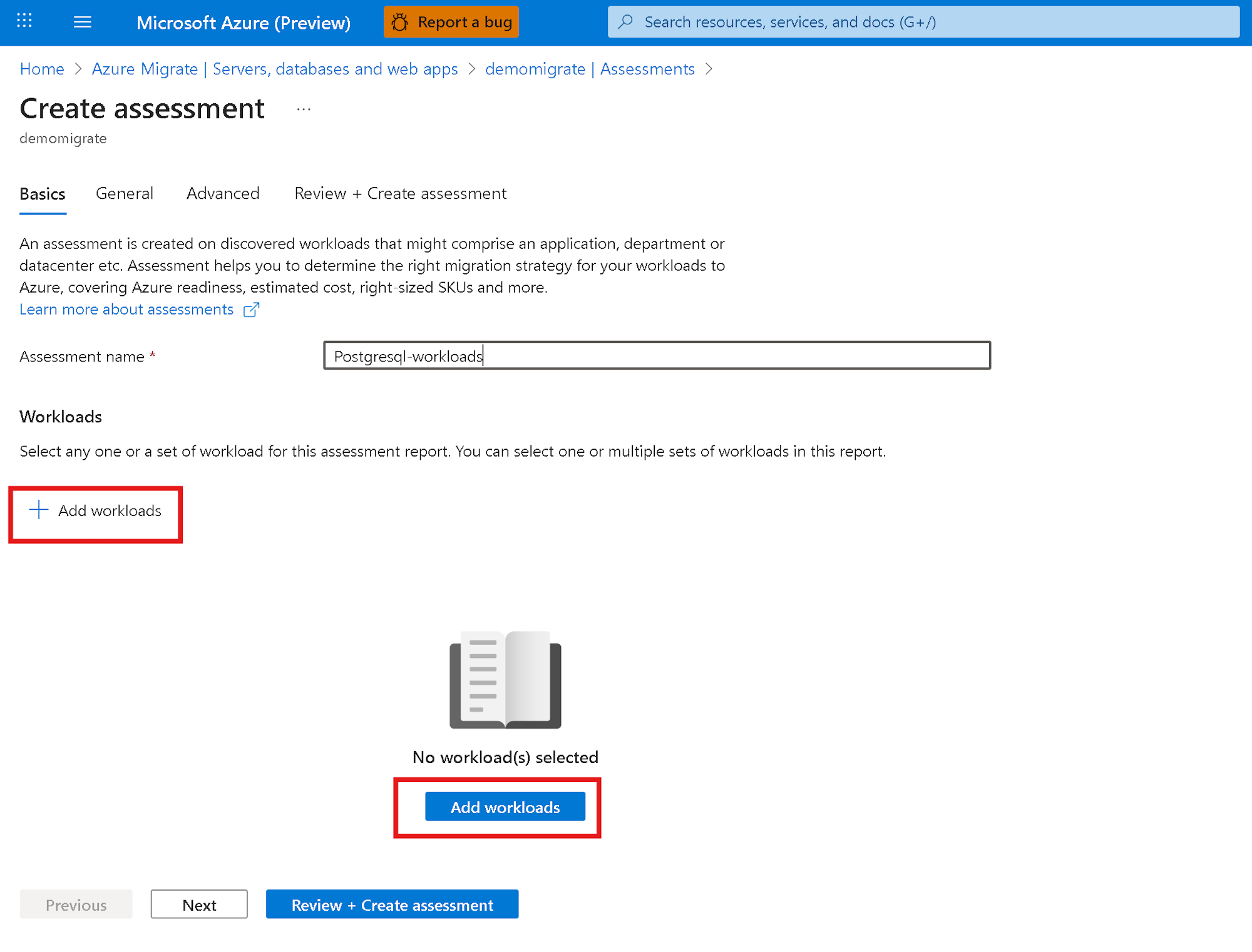 評価を開始して PostgreSQL ワークロードを評価します。