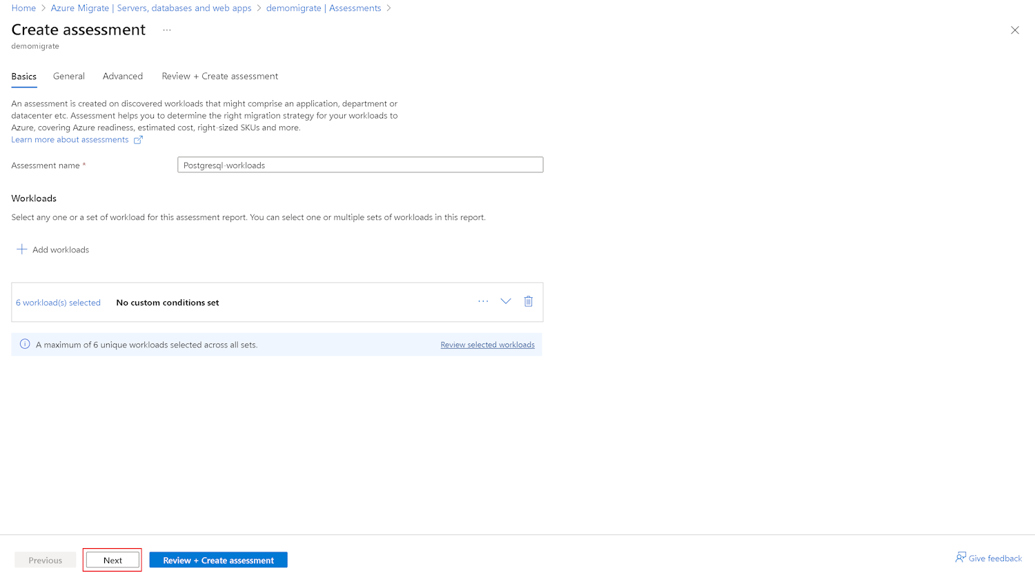 PostgreSQL ワークロードを追加したら、[ 次へ ] を選択して続行します。