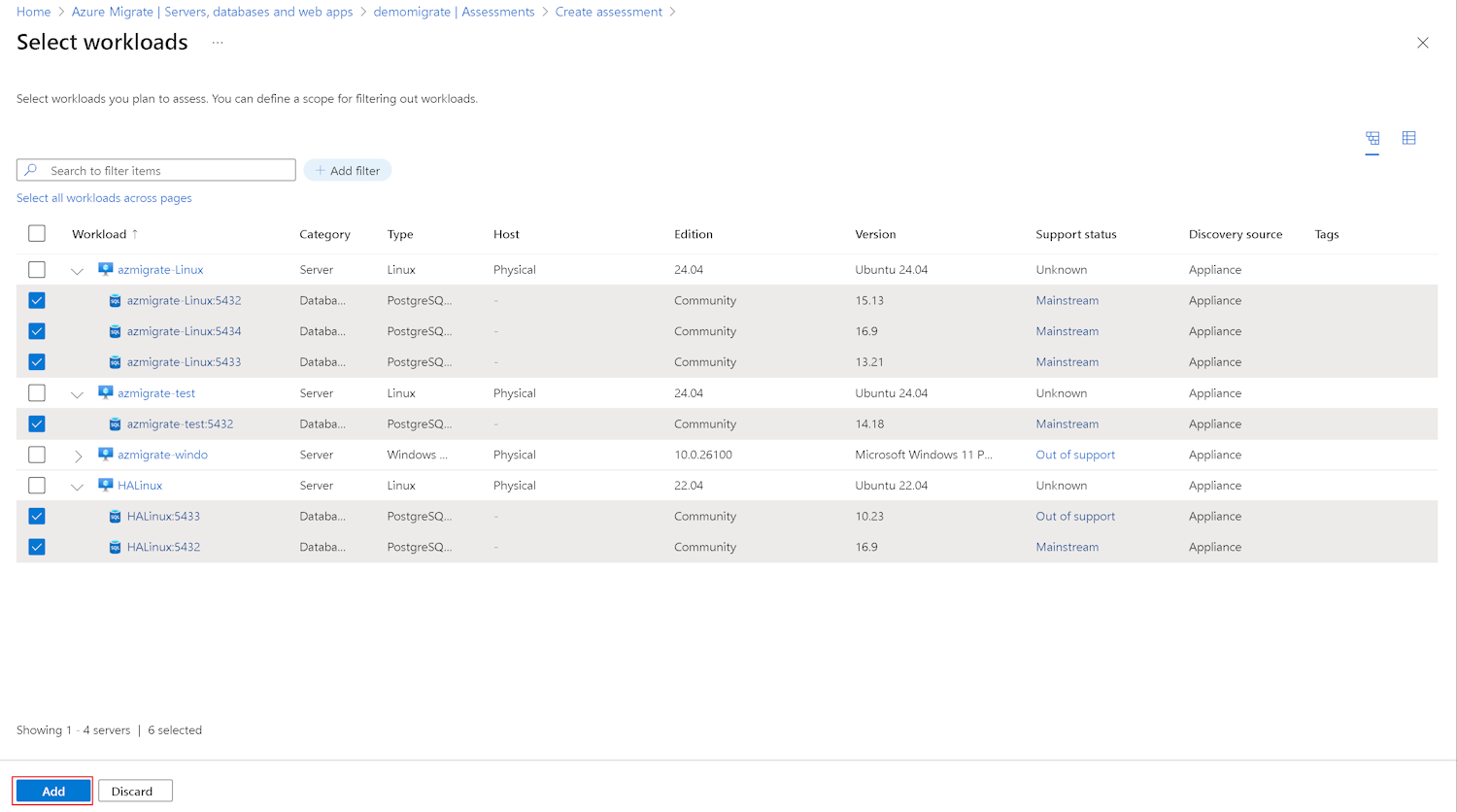 - Azure Database for PostgreSQL フレキシブル サーバーへの移行について PostgreSQL インスタンスを評価する前に、Azure Migrate アプライアンスを使用してインスタンスを検出してください。 詳細については、 探索のチュートリアルに従ってください。