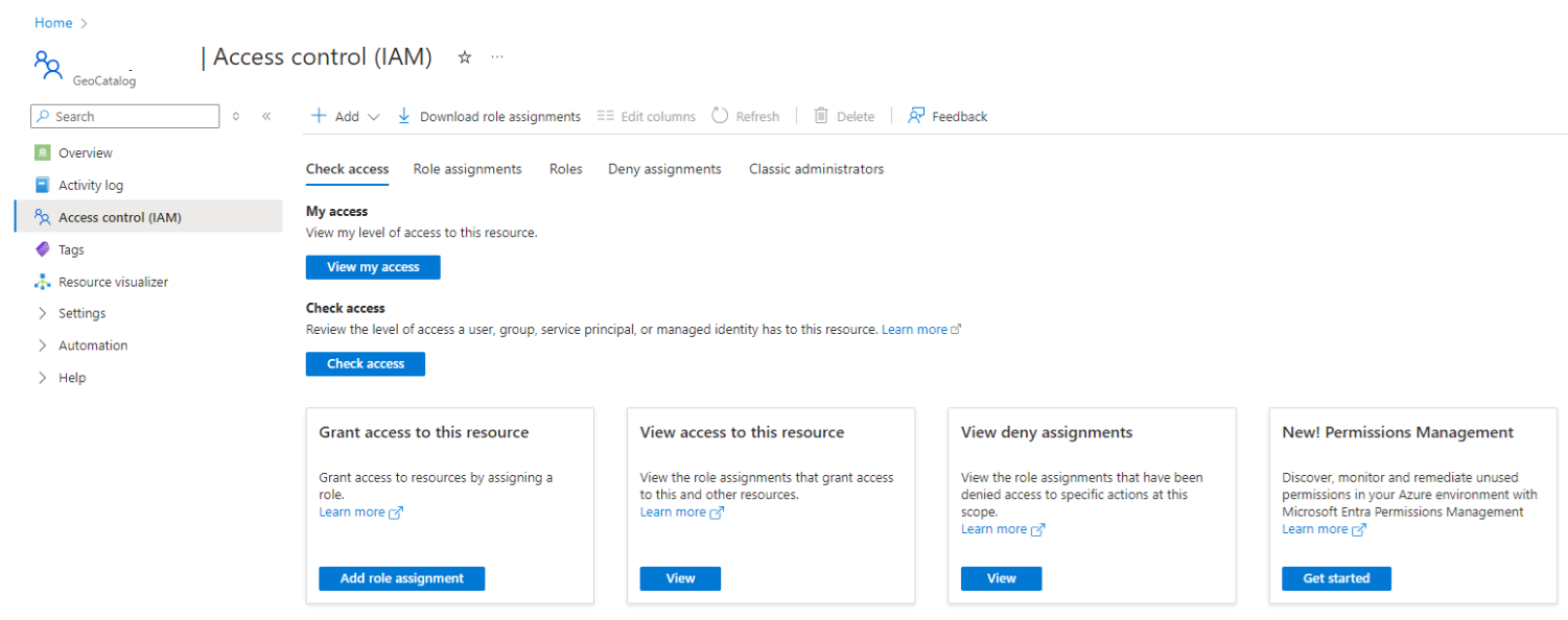 Azure portal で、左側の Microsoft Planetary Computer Pro リソース IAM タブに移動します。