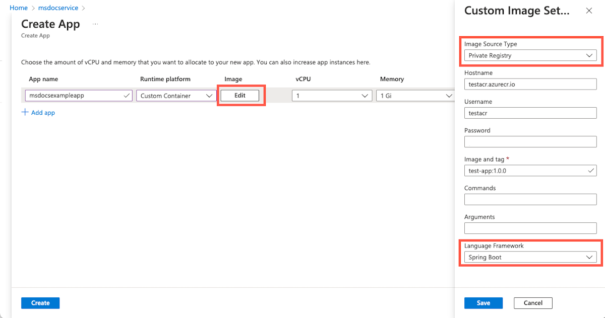 az spring app deploy \ --resource-group <your-resource-group> \ --name <your-app-name> \ --container-image <your-container-image> \ --service <your-service-name> --container-registry <your-container-registry> \ --registry-password <your-password> | --registry-username <your-username>