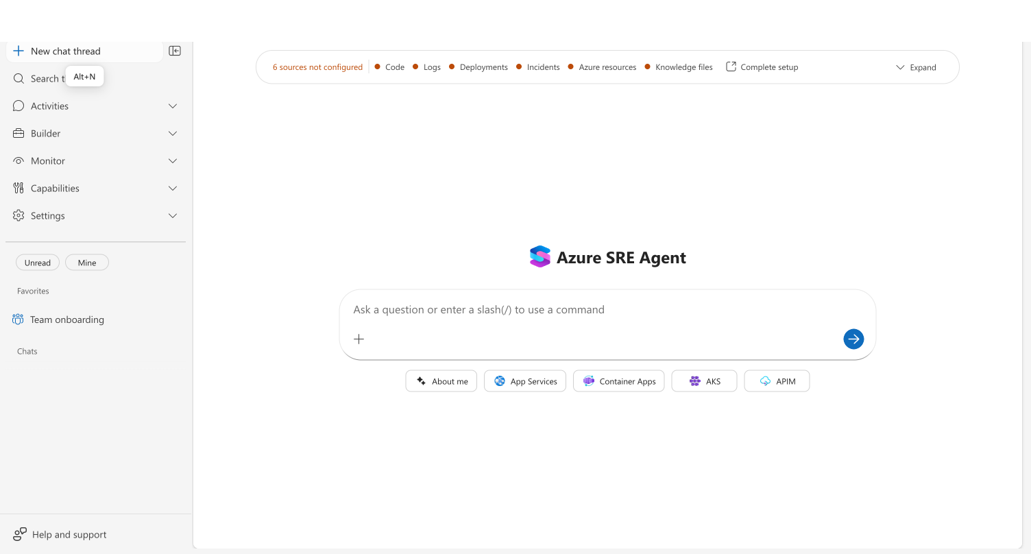 "SRE エージェントはアプリについて何も知らないし、質問に答えることはできません" というメッセージが表示された場合は、まず Code を接続します。 調査品質に最も大きく影響します。