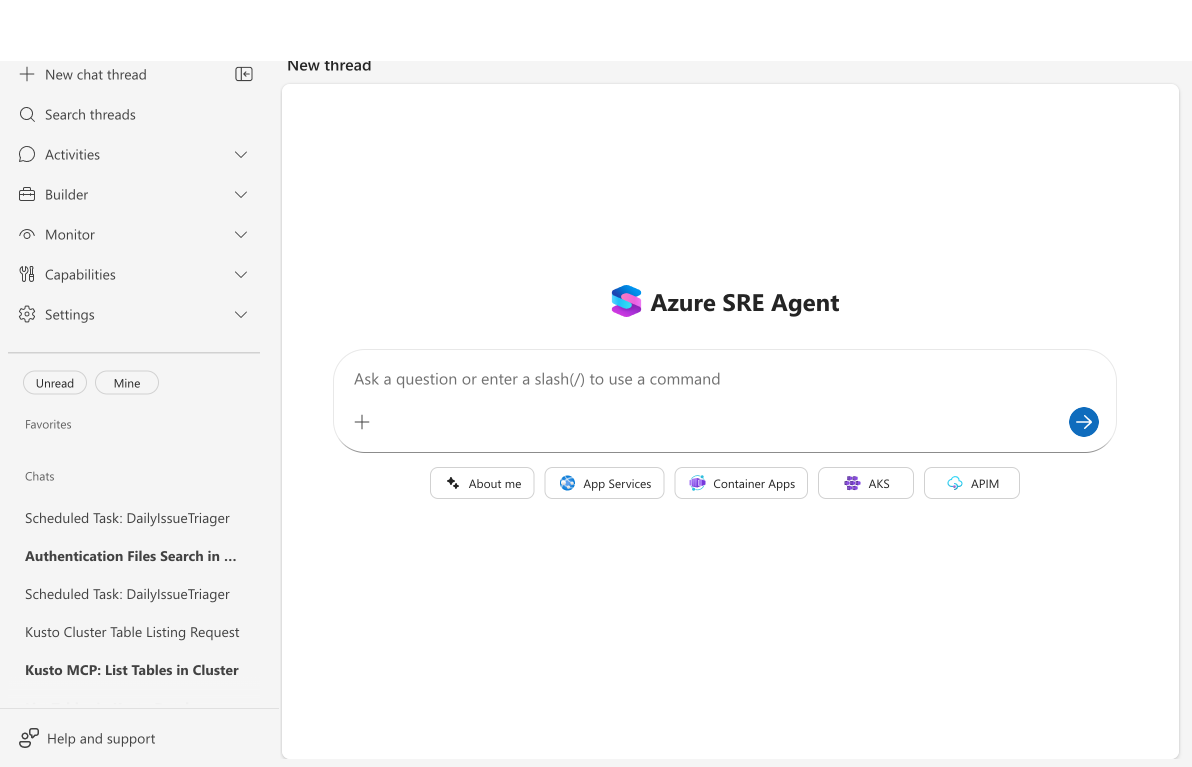このチュートリアルでは、DocsGuide (組み込みのドキュメント機能) を使用して、Azure SRE エージェントの機能、構成、概念についてエージェントに質問します。 DocsGuide はライブの公式ドキュメントから回答するため、機能の進化に伴って応答は最新の状態に保たれます。
