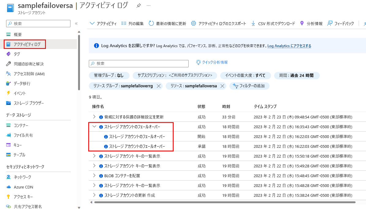 フェールオーバーの詳細な状態を表示するには、通知の [アクティビティ ログのその他のイベント] リンクを選択するか、ストレージ アカウントの [アクティビティ ログ] ページに移動します。