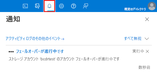 フェールオーバーの状態を確認するには、Azure portal のグローバル ページ ヘッダーの右端にあるベル型の通知アイコンを選びます。