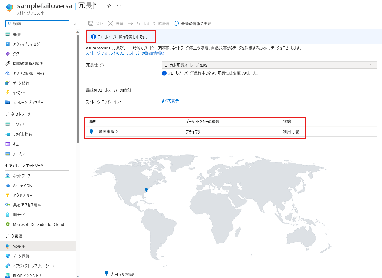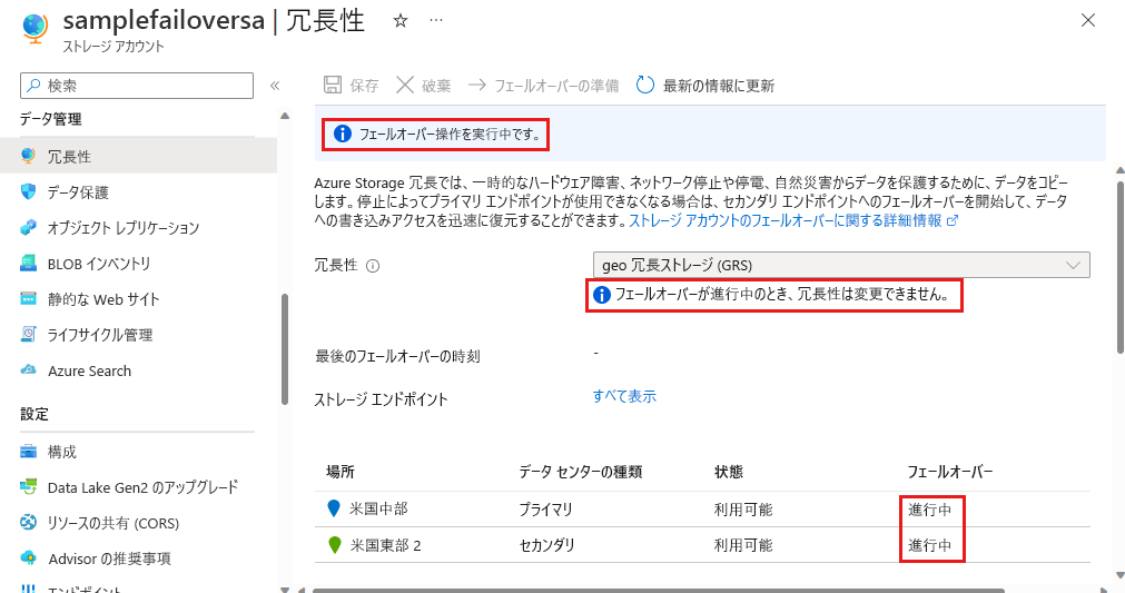 ストレージ アカウントの冗長ページに、フェールオーバー状態の更新を示すメッセージが表示されます。