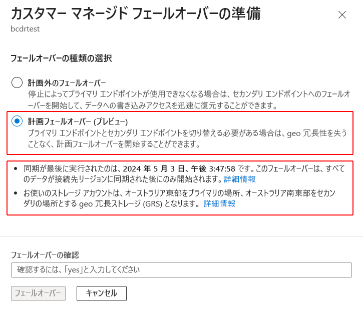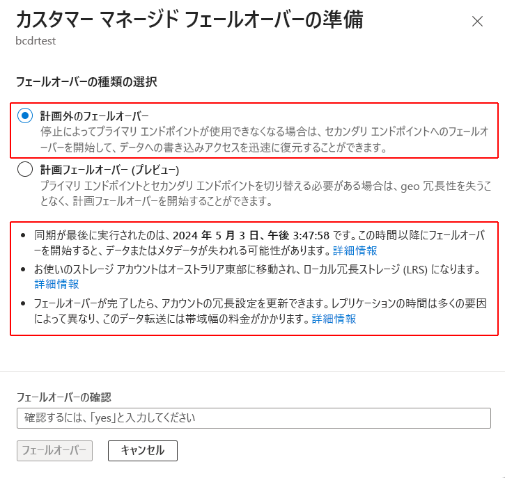 Unplanned Failover:データ損失の可能性を警告し、フェールオーバー後に geo 冗長を手動で再構成する必要があることを知らせるアラートが表示されます。